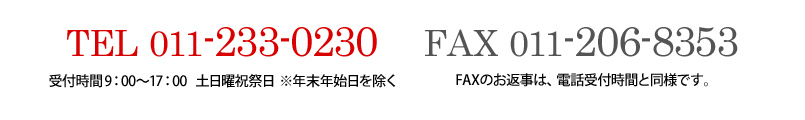 〒060-0061 札幌市中央区南1条西11丁目327番地 第3一条ビル2F >>>アクセスマップ TEL:011-233-0230 FAX:011-206-8353